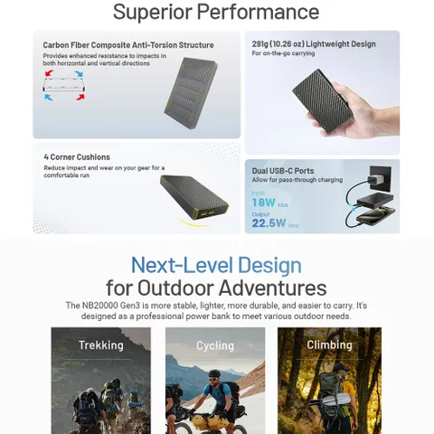 Traveling? The NB20k is approved for airline travel in accordance with UN38.3 protocols. Perhaps a perilous destination? Its lightweight yet strong carbon fibre case ensures that NB20k is highly resistant to puncture, abrasion, and impact. Additionally, the NB20k is IPX5-rated water-resistant and provides safeguards against short-circuiting, overcharging, overdischarging, and overheating.